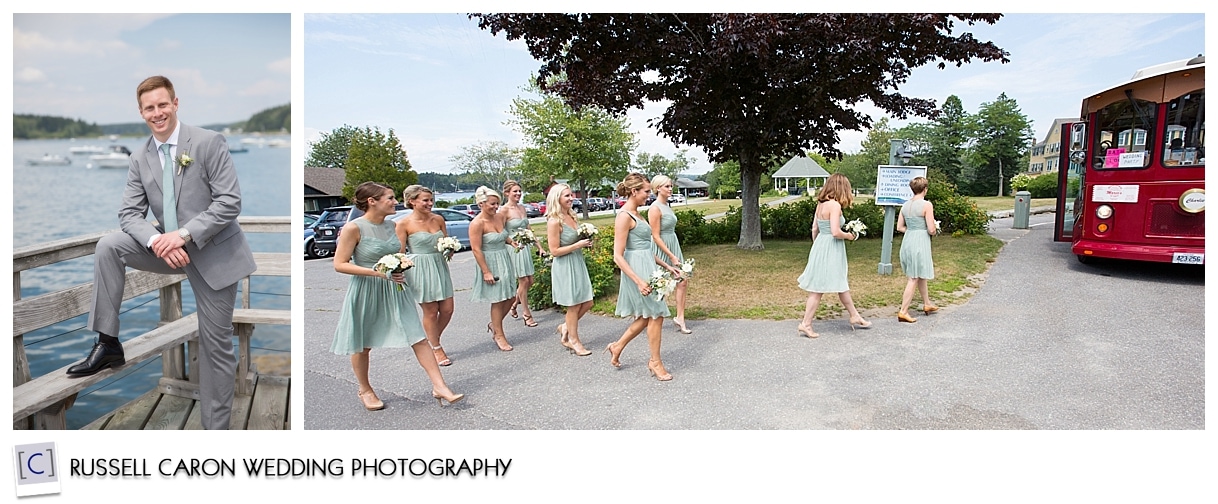 Charlie and his groomsmen on the dock at Sebasco Harbor Resort, below two panels.
