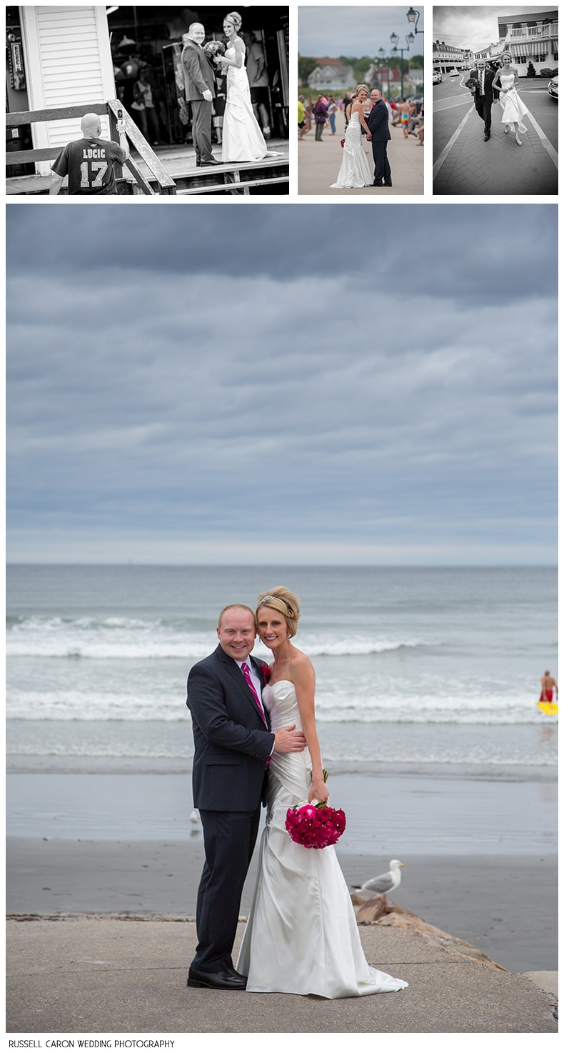Holly and Tyler had a fun-filled wedding at Stage Neck Inn, Friday, July 26, 2013, York Harbor, Maine. Here, on a quick side trip to York Beach, Holly and Tyler pause in front of the iconic arcade bowling alley (and below at the famous Fun O Rama). While weather forecasts had painted a strong threat of heavy rains, reality was we were able to easily be outdoors under interesting clouds and no precipitation until the time for the actual outdoor ceremony – which was moved under a patio cover. It was a truly fun day, accented by the couple’s willingness to take some time for memorable moments for Stage Neck Inn, York Harbor Maine wedding photography.