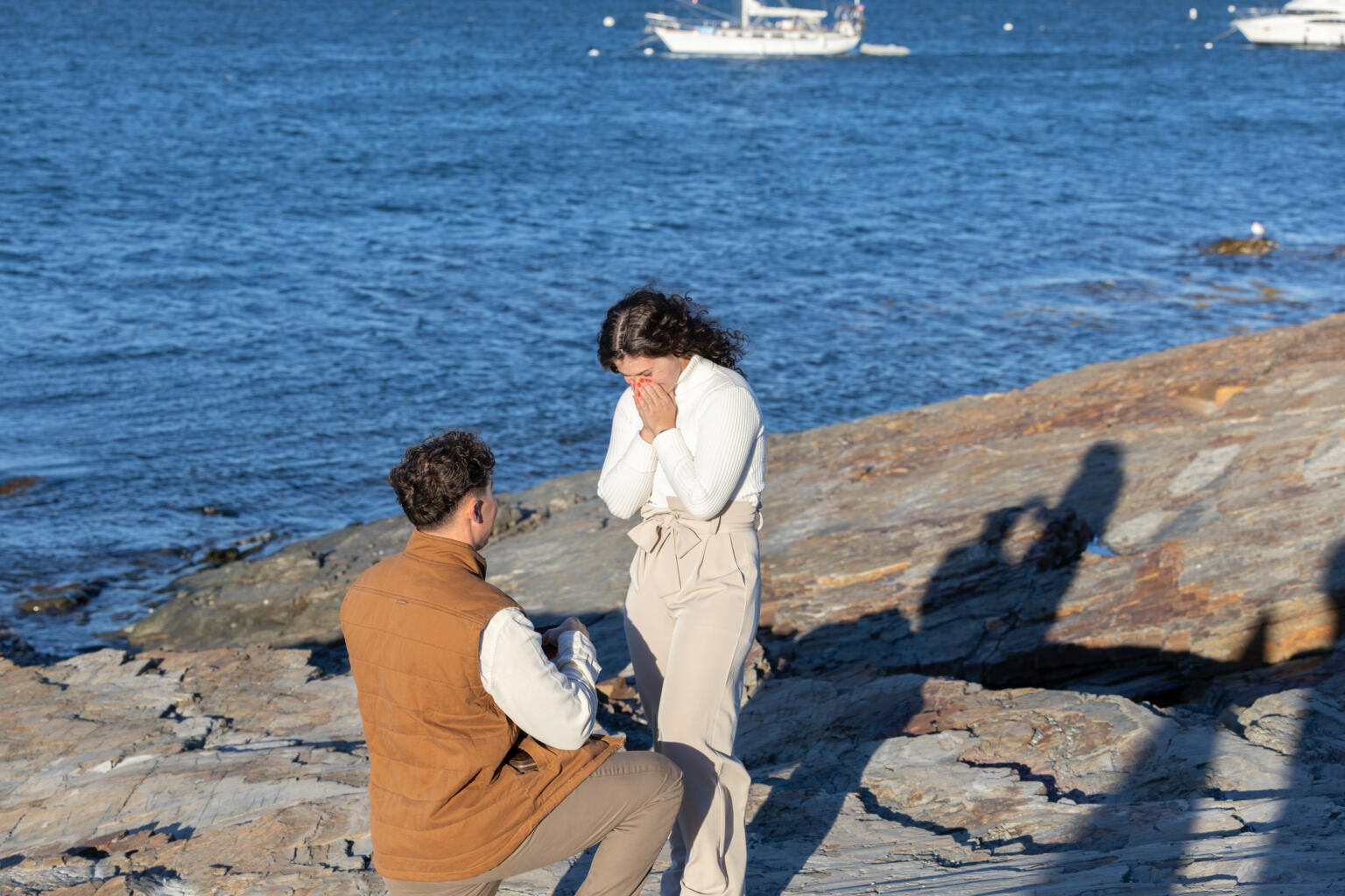 Eric made the smart choice to hire professional photography for his surprise proposal to Lauren in Bar Harbor, Maine. Loving secret proposals as we do, this was a great session for us (well, me, Russ, actually, as it was a one-photographer job ). While the weather forecast was for blue skies, the predicted blustery winds certainly happened, too. Maybe one of the windiest otherwise-good-weather days on record, in fact. Lots of planning meant we both had scripts and timelines, and all went according to plan, wind and all! Following the big question (which we think Lauren ‘knew’ might be happening this particular weekend) a “mini” engagement session with late day setting sun as the background was next.